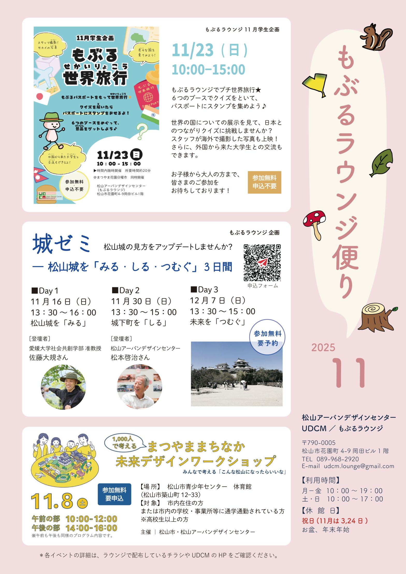 「もぶるラウンジ便り11月号」を発行しました 【2025年11月号の内容】 ▪11/23(日) 学生企画『もぶる世界旅行』開催 ▪11/16(日),30日(日),12/7(日) ラウンジ企画『城ゼミ』開催 ▪11/8(土) 『まつやままちなか未来デザインワークショッ […]