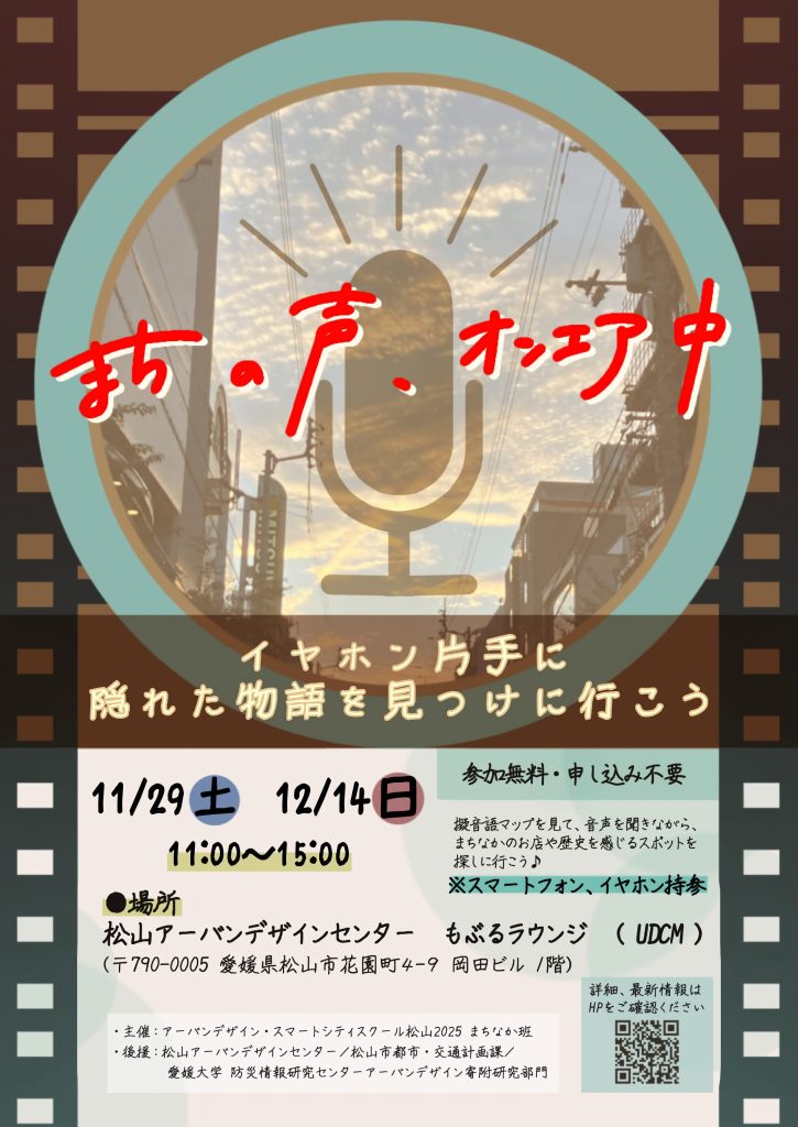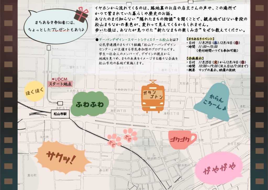 イヤホンから流れてくるのは、路地裏のお店の店主さんの声や、この場所でかつて営まれていた暮らしや歴史のお話。あなたのまだ知らない“隠れたまちの物語”を聞くことで、観光地ではない普段の松山まちなかの景色が、変わって見えてくるかもしれません。歩いた後は、あなたが見つけた“新たなまちの楽しみ方”をぜひ教えてください。