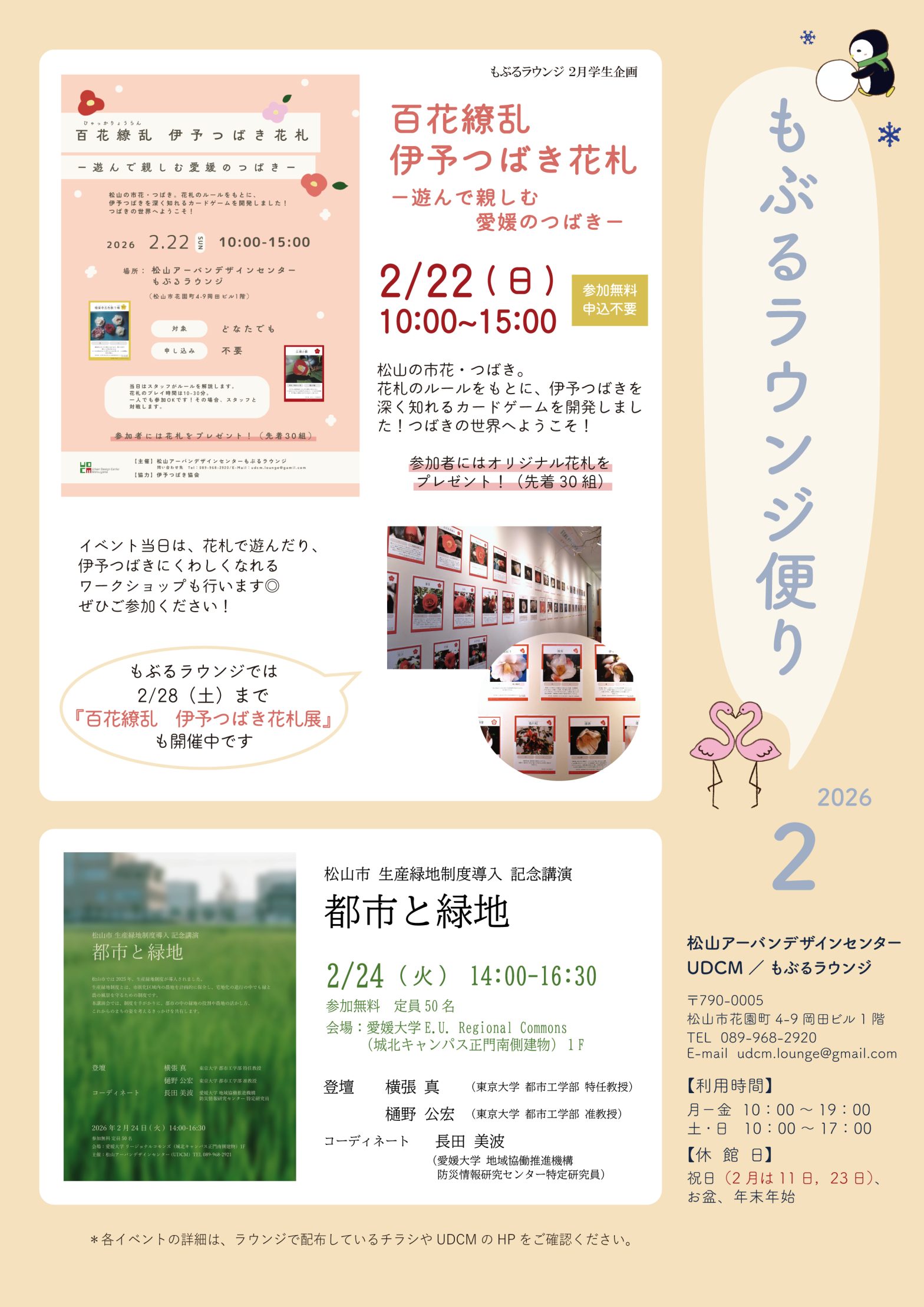「もぶるラウンジ便り2月号」を発行しました 【2026年2月号の内容】 ▪2/22(日)学生企画『百花繚乱 伊予つばき花札』開催 ▪2/24(火)松山市 生産緑地制度導入 記念講演『都市と緑地』開催 ▪2月イベントカレンダー ▪学生企画 実施レポート ▪ライブラリ […]