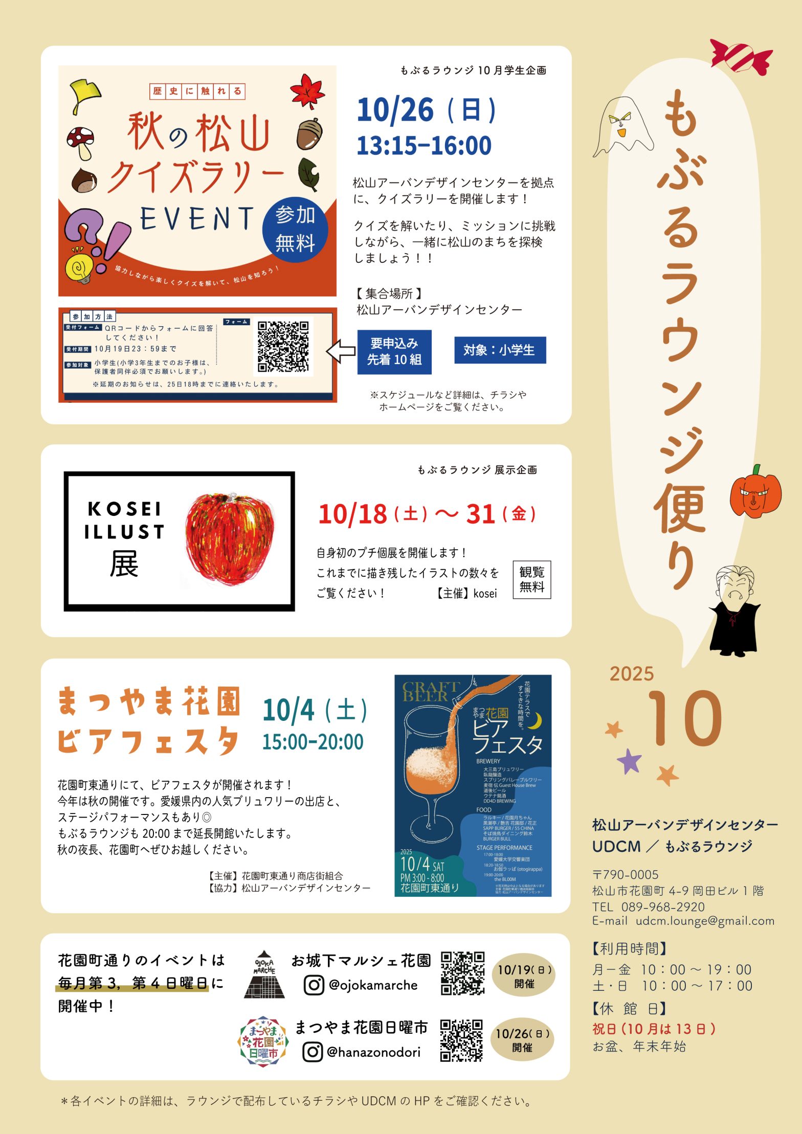 【2025年10月号の内容】 ▪10/26(日) 学生企画『秋の松山クイズラリー』開催 ▪10/18(土)~31(金) ラウンジ展示企画『KOSEI ILLUST展』開催 ▪10/4(土) 『まつやま花園ビアフェスタ』開 […]